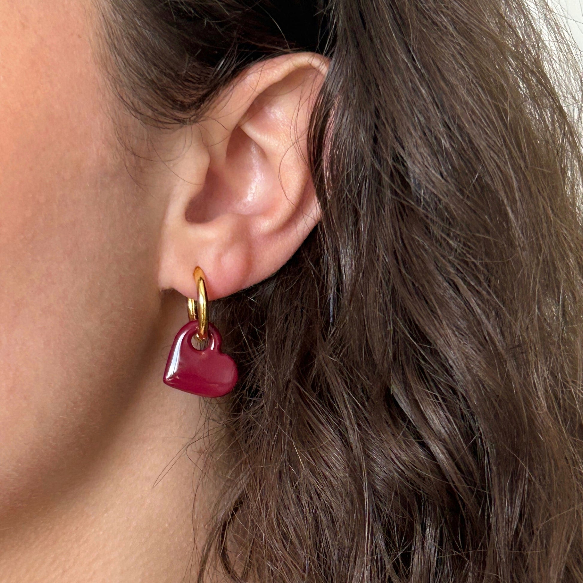 Boucles d'oreilles cœur rouge foncé - Fait main