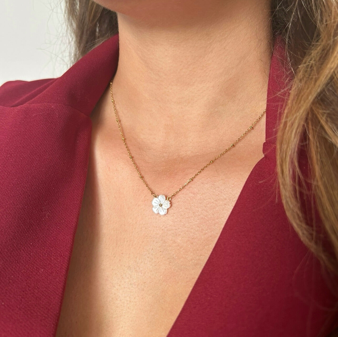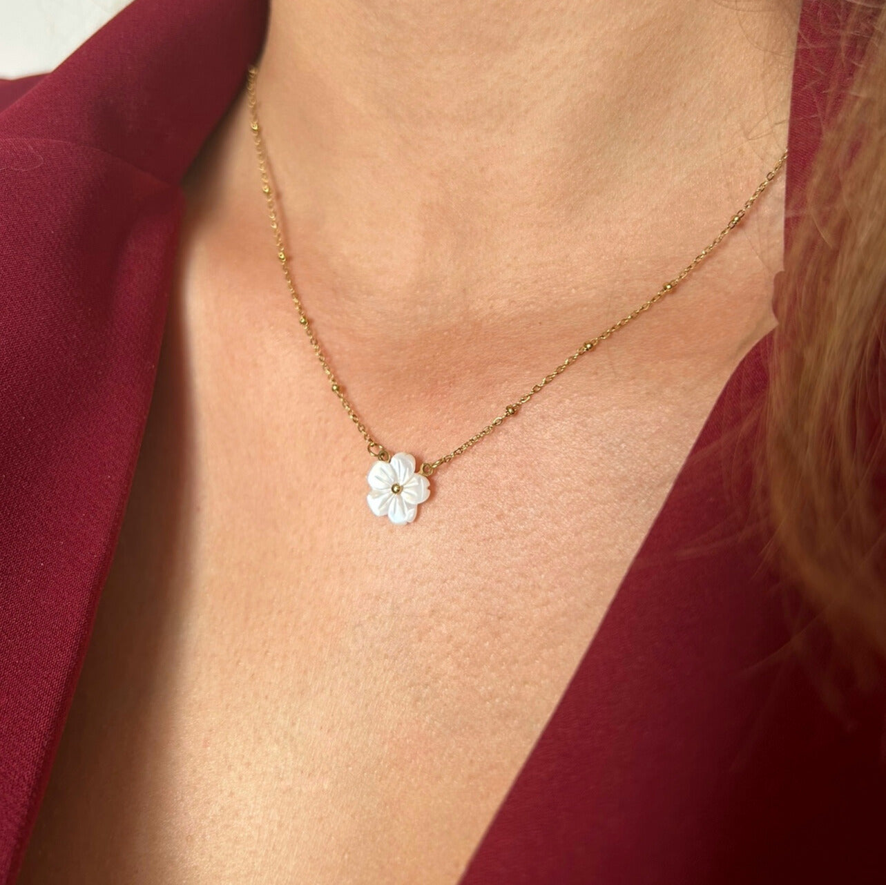 Élégant et intemporel, ce collier met en valeur une délicate fleur nacrée suspendue sur une fine chaîne en acier inoxydable doré réglable.