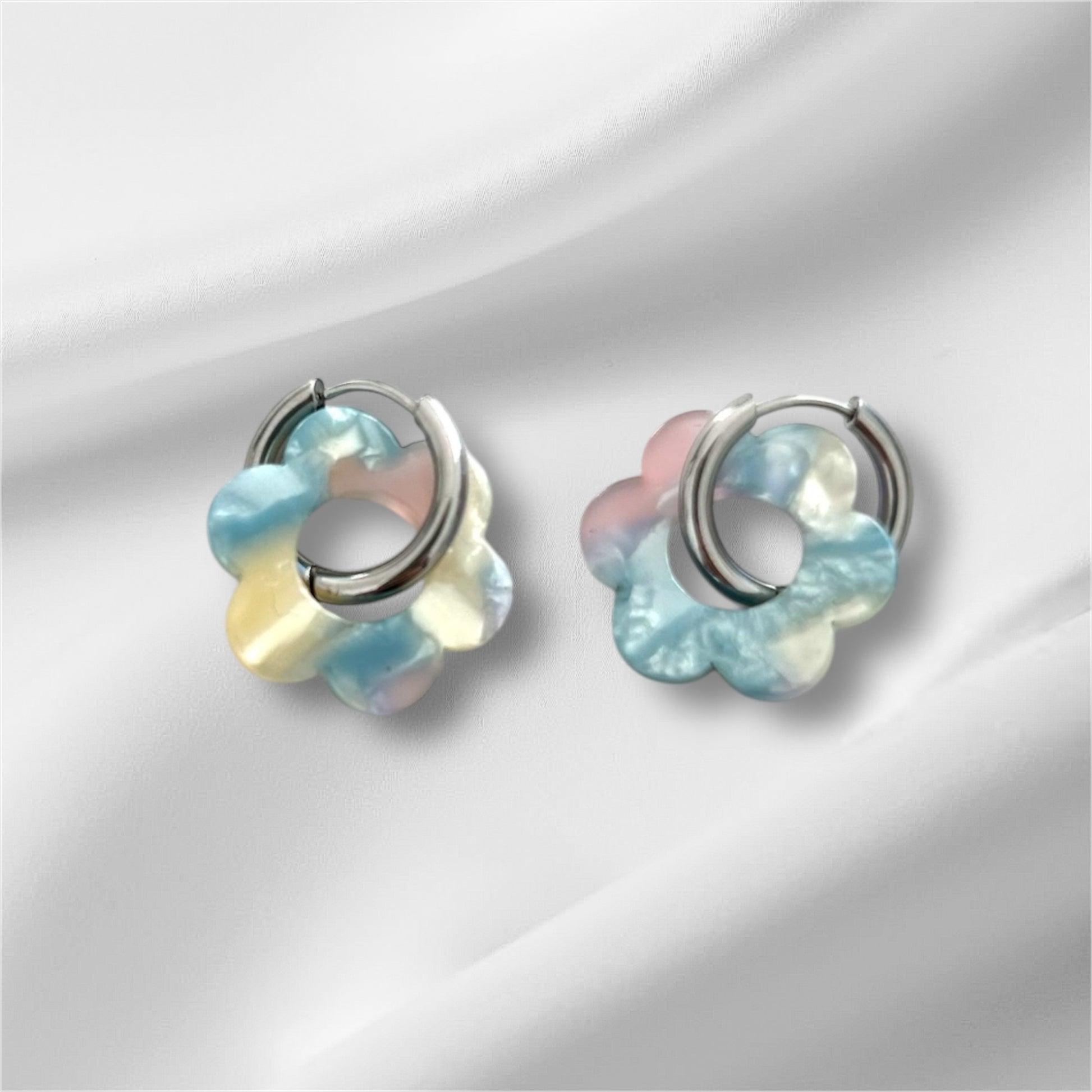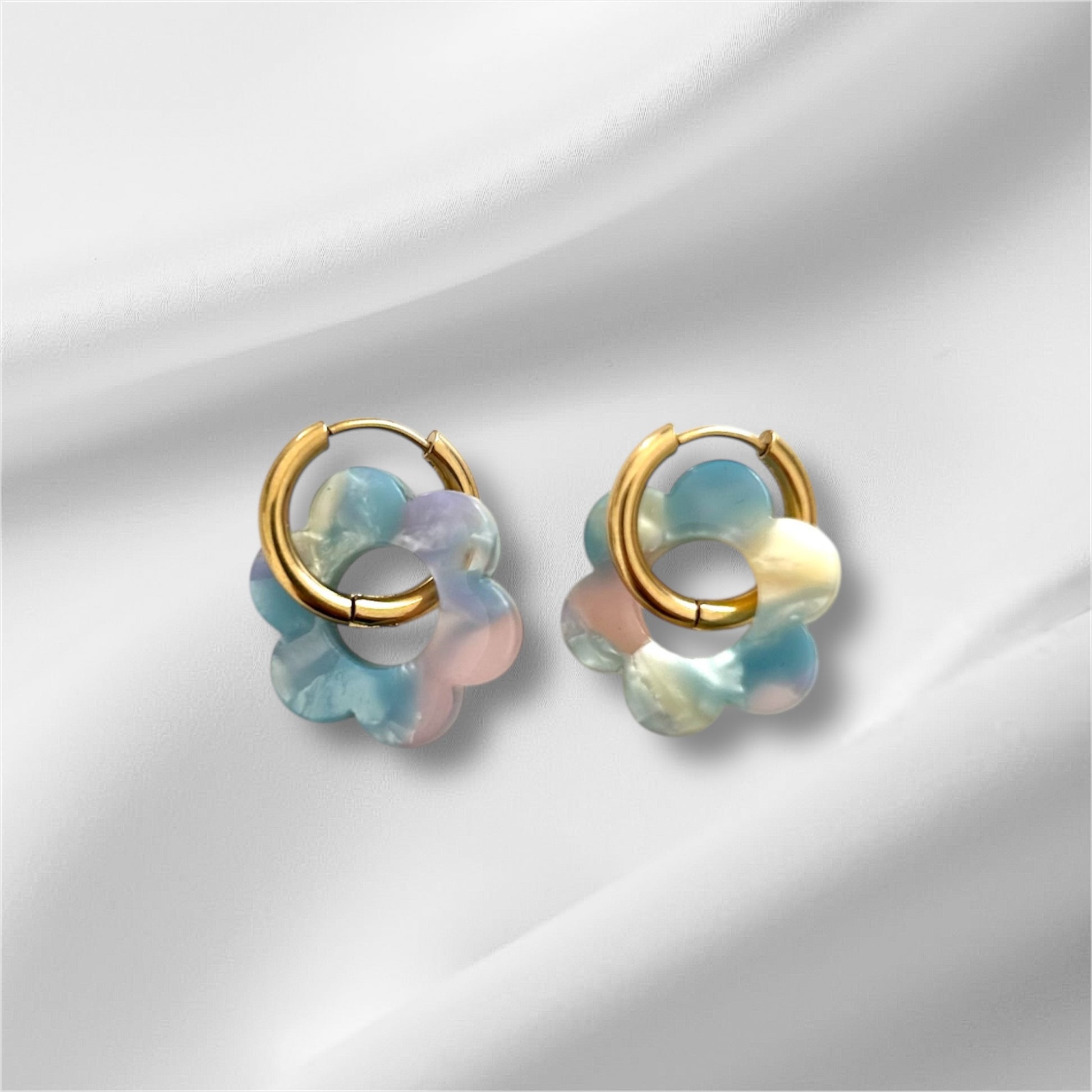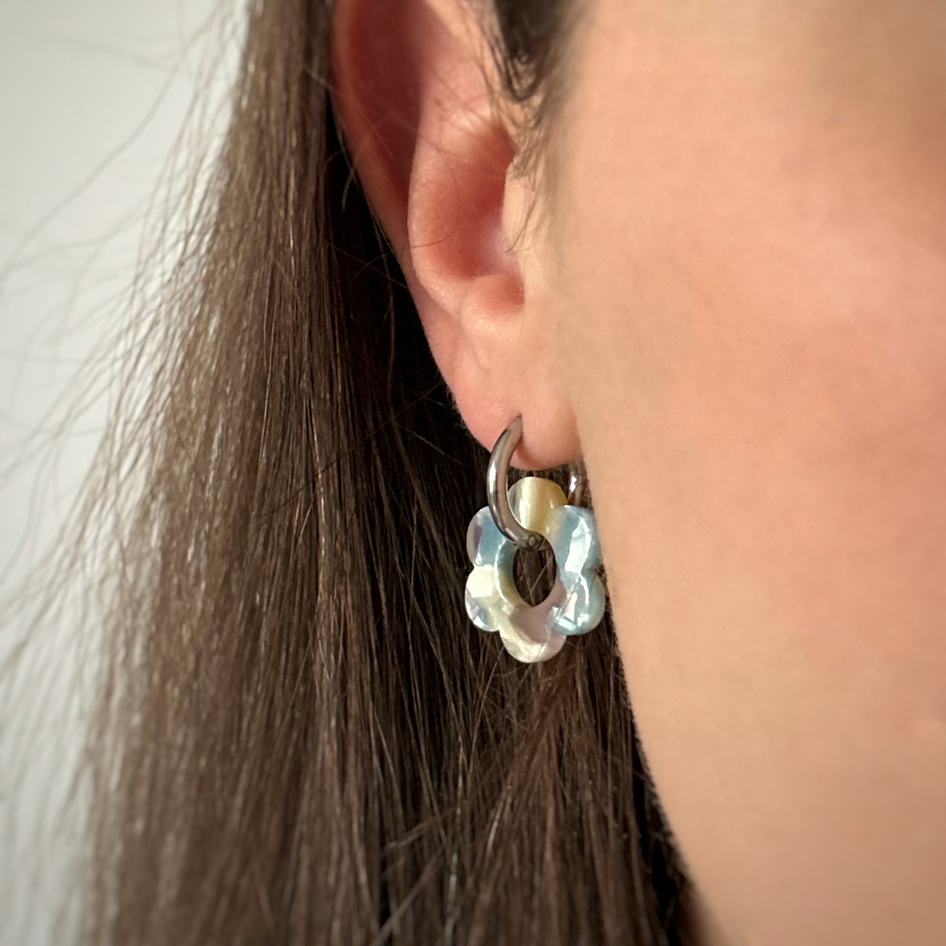Boucles d’oreilles et fleurs en acétate.