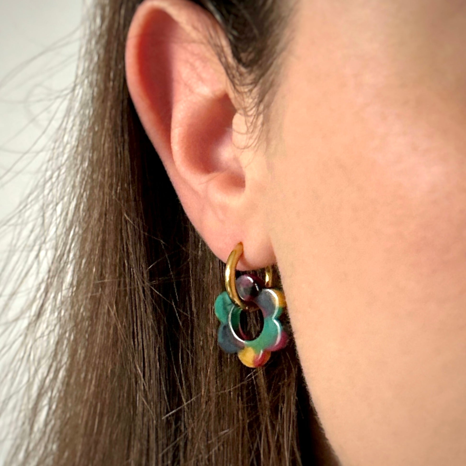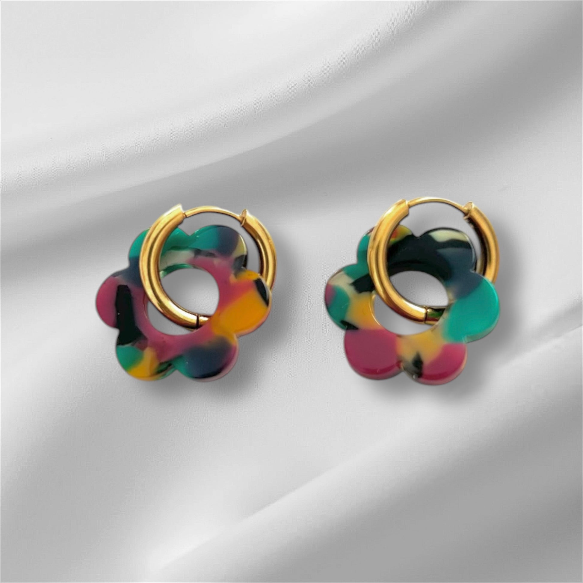 Boucles d’oreilles créoles fleurs en acétate.