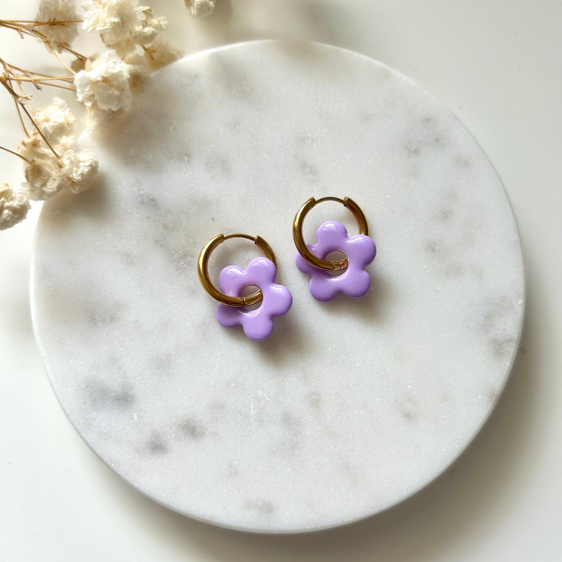 Élégantes et légères, ces boucles en pâte Fimo lilas sont entièrement faites main. Montées sur des créoles en acier inoxydable, elles allient style minimaliste et confort au quotidien.
