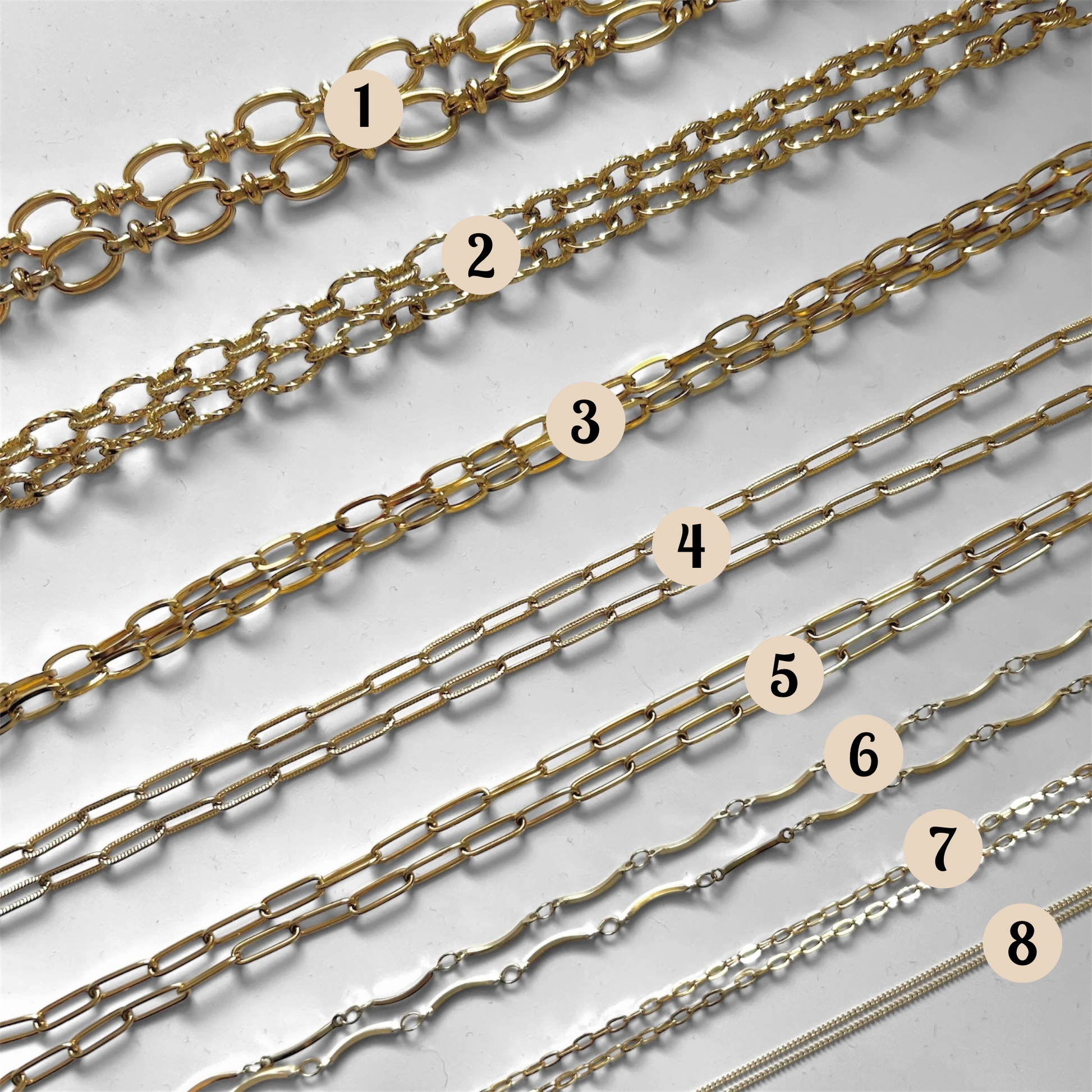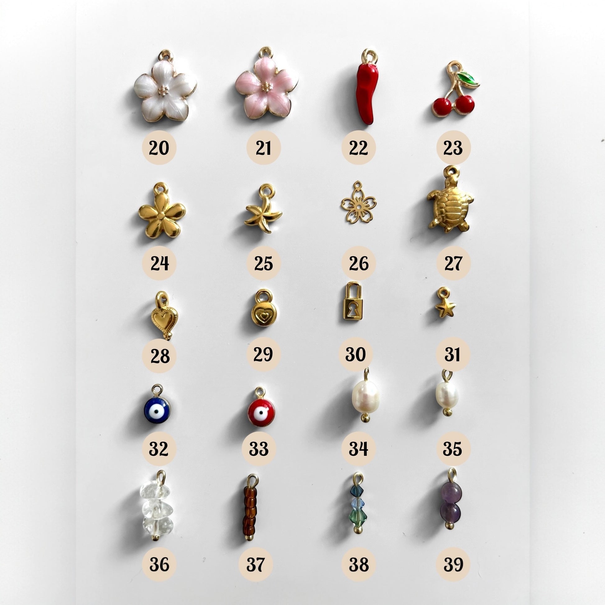 Créez le collier de vos rêves ! Sélectionnez votre chaîne et vos charms parmi notre collection variée. Pour composer votre bijou, consultez les photos et indiquez les numéros des charms dans l’ordre souhaité (de gauche à droite) dans le champ dédié à cet effet.